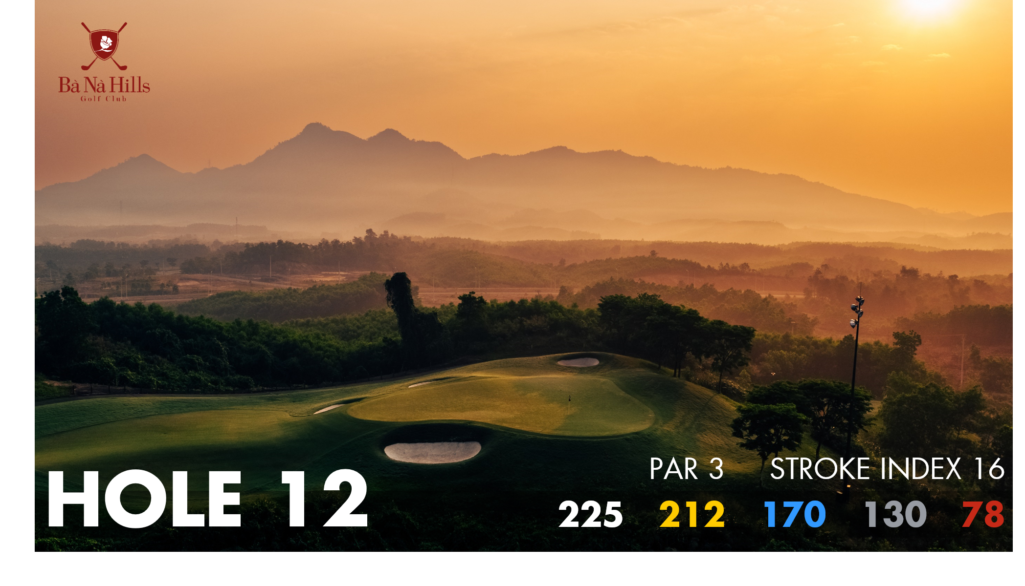 A dramatic landscape for a par 3 backdrop and large elevation changes makes the 12th hole both picturesque and testing for all abilities. The tee shot requires one or two clubs less than usual due to the elevation change. Be careful to check the wind direction too. Short of the pin is preferable as the green has a lot of trouble behind. Once on the green, be sure to read your putts with care as there are some subtle breaks.