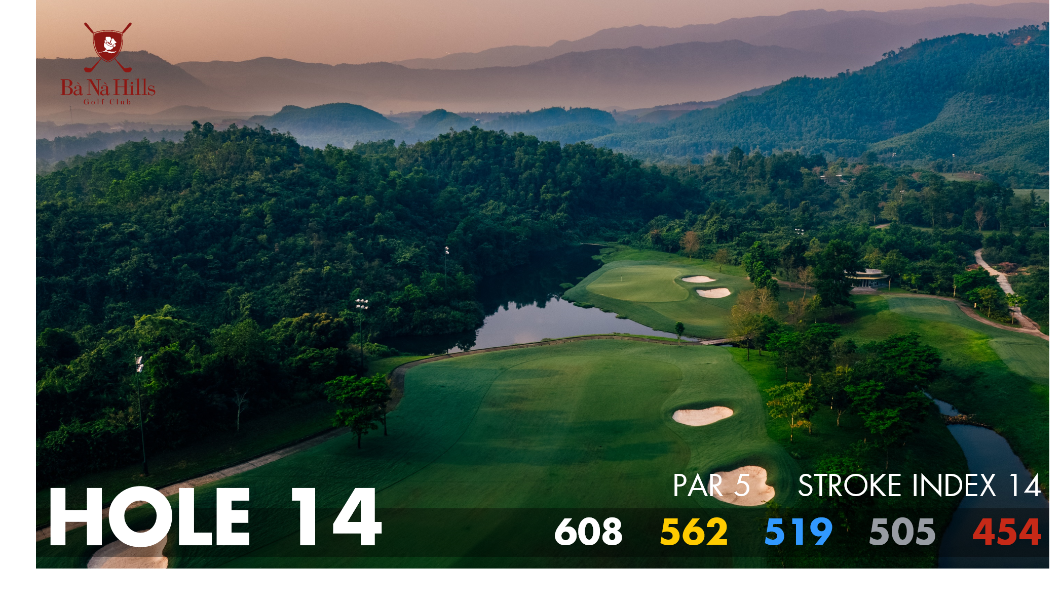 14번 홀은 세 번의 정확한 샷이 필요한 정통 파5 홀로, 페어웨이 양쪽을 따라 이어지는 울창한 수풀과 워터 해저드를 피해 가야 합니다. 티샷을 안정적으로 보내면 롱 아이언이나 하이브리드로 물 앞에 레이업하여 편안한 피치 샷을 남길 수 있습니다. 세컨 샷 이후 어프로치에서는 자신감 있는 샷이 필요한데, 그린 오른쪽에는 두 개의 얕은 벙커가, 왼쪽 앞에는 워터 해저드가 기다리고 있기 때문입니다.